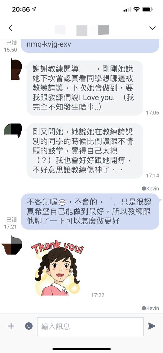 由於線上課程的受限,其他人可能看不到,因此教練在確認其他孩子沒有受到影響後當下不做處理,並不再請孩子們比讚,然後安排了機會單獨和他談談。